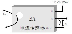 如圖所示穿心輸入Iac,電流輸出型傳感器的輸出為共地電流源,電壓輸出型傳感器的輸出為共地電壓源。圖中RL是用戶負載,輸出為電流時,負載≤400Ω(12V供電)或≤800Ω(24V供電);輸出為電壓時負載≥1kΩ。