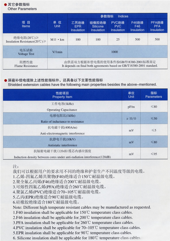 一般用聚氯乙烯緣和護套補償導線或電纜具有優良的防潮、耐磨及阻燃特性;耐高溫氟塑料緣和護套補償導線或電纜采用連續擠出工藝,更有耐高溫、耐寒、耐酸堿油水、不延燃、抗老化等優越性,產品質量高于國標GB/T4989-94(等效采用IEC584-3)的規定。